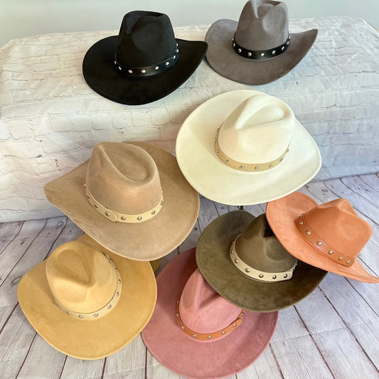 VEGAN SUEDE COWBOY HAT W/ STUDDED LEATHER BELT