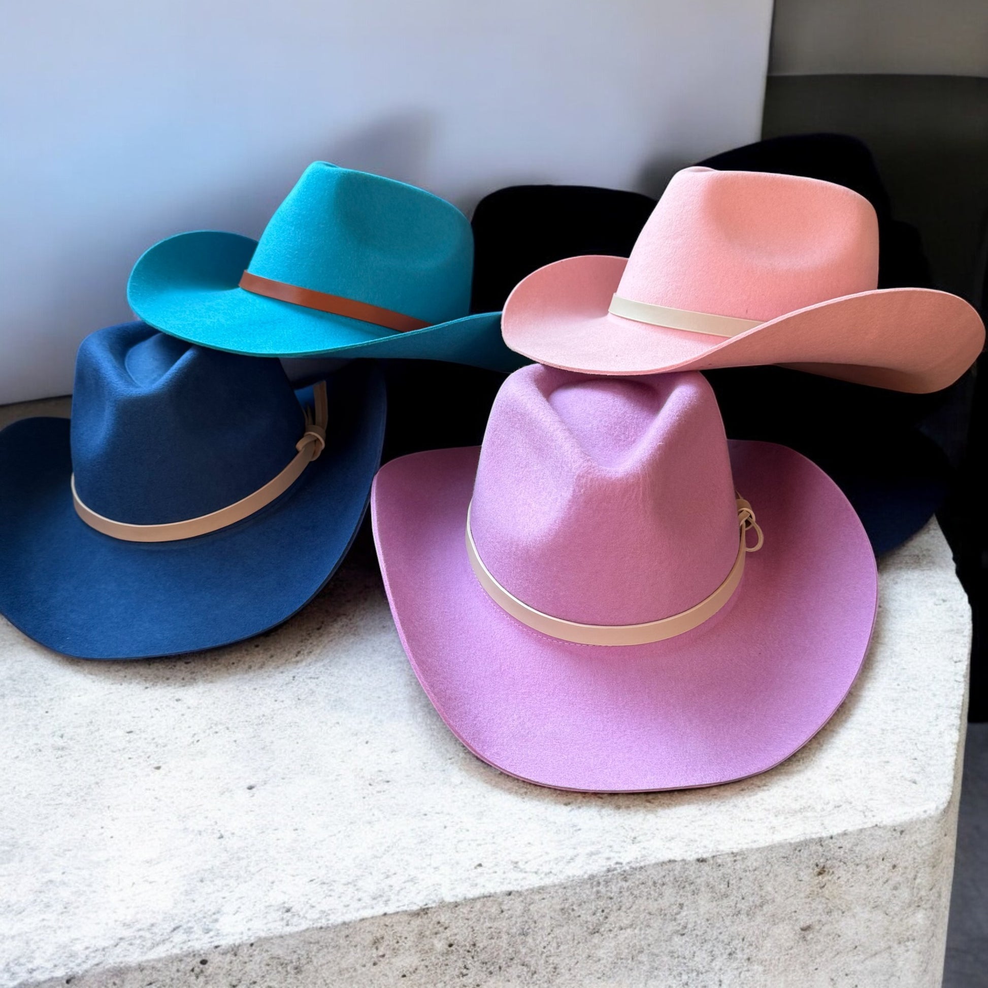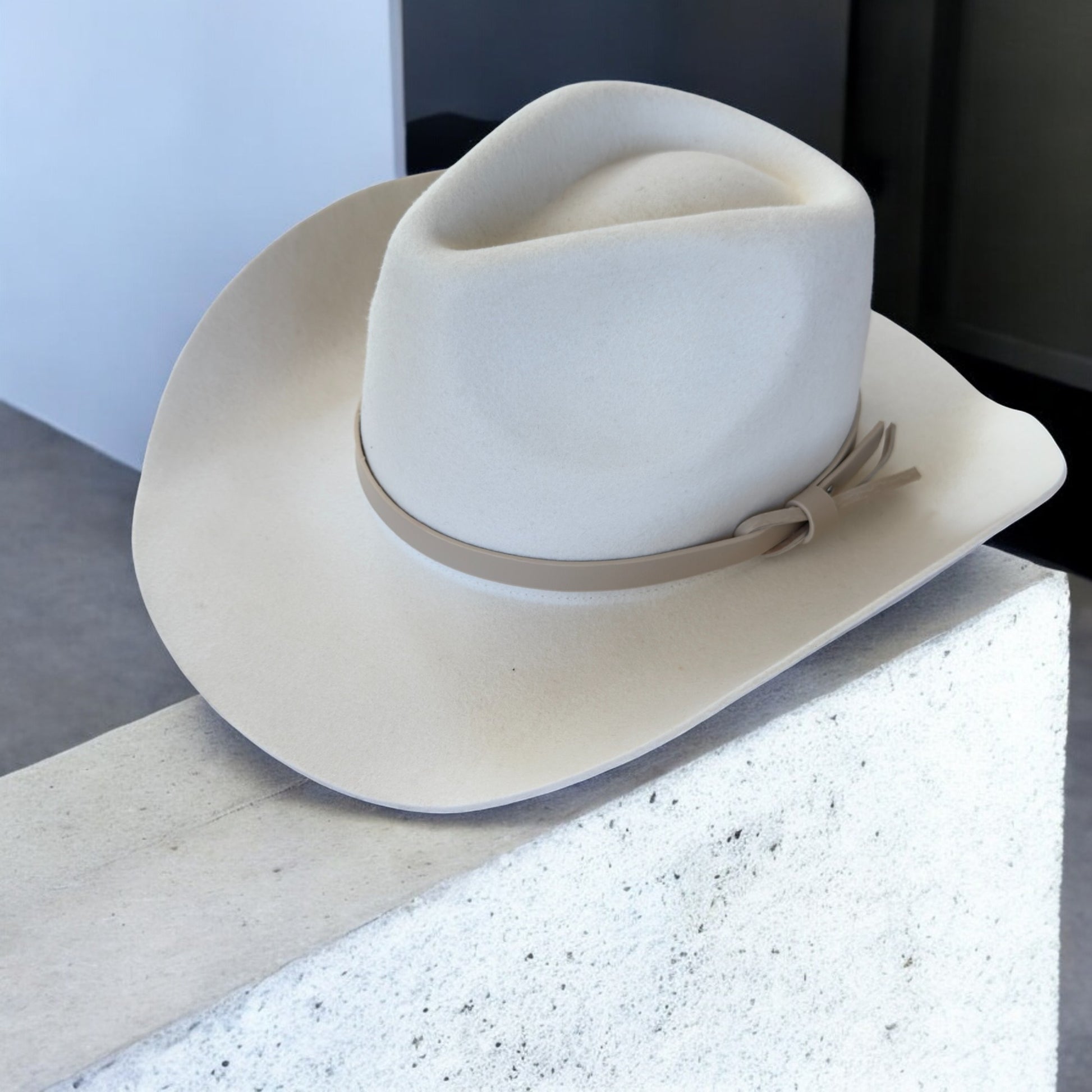 Crafted from 100% Australian wool, this cowboy hat combines timeless design with modern versatility. The teardrop crown, structured flat brim, and sleek leather hat band make it both stylish and practical. The plain finish allows for custom additions, making it a favorite for boutiques and hat bars.