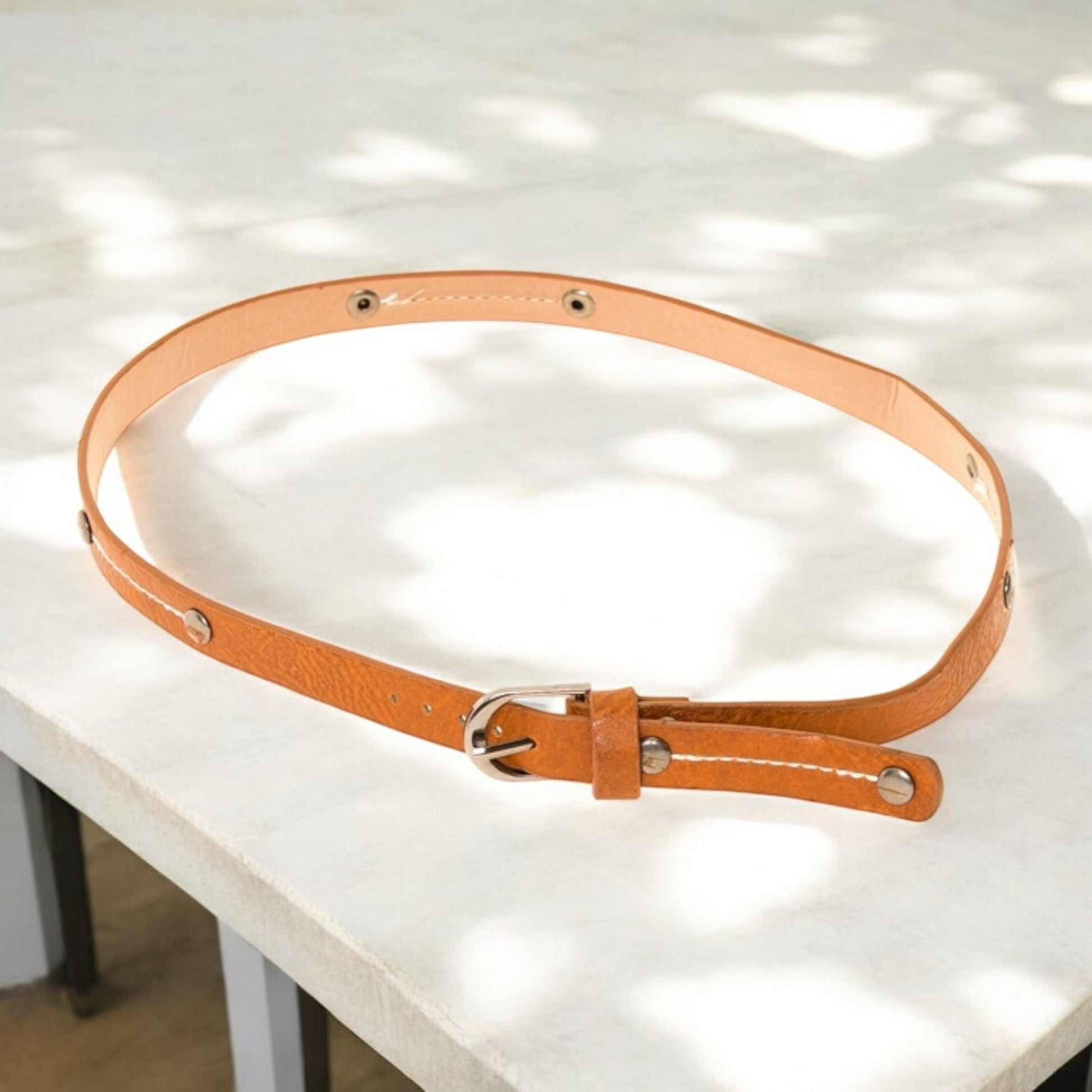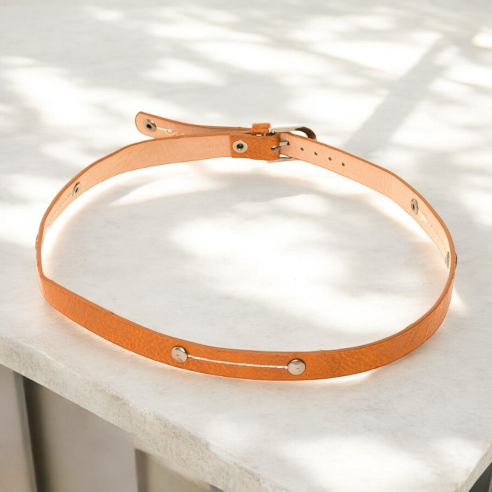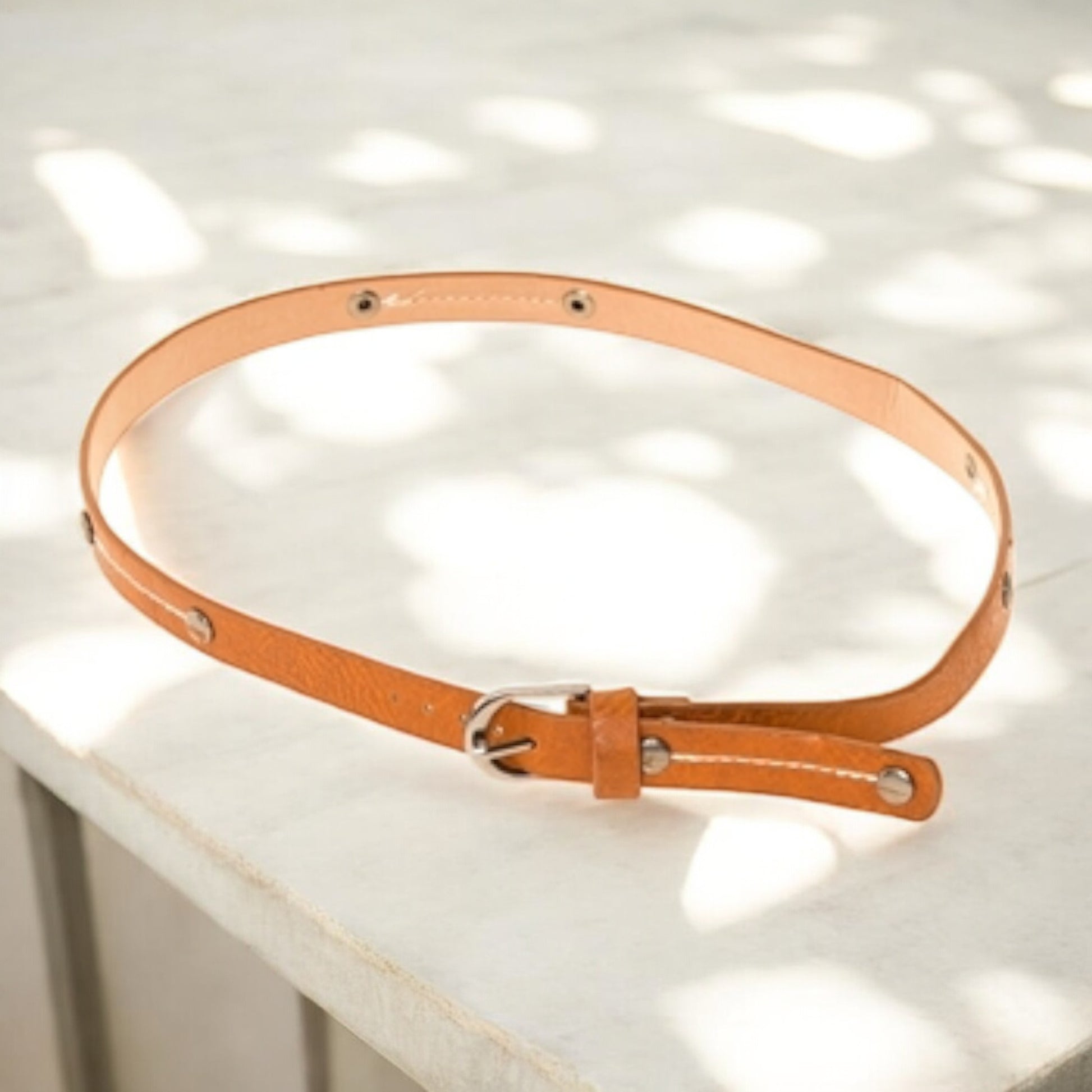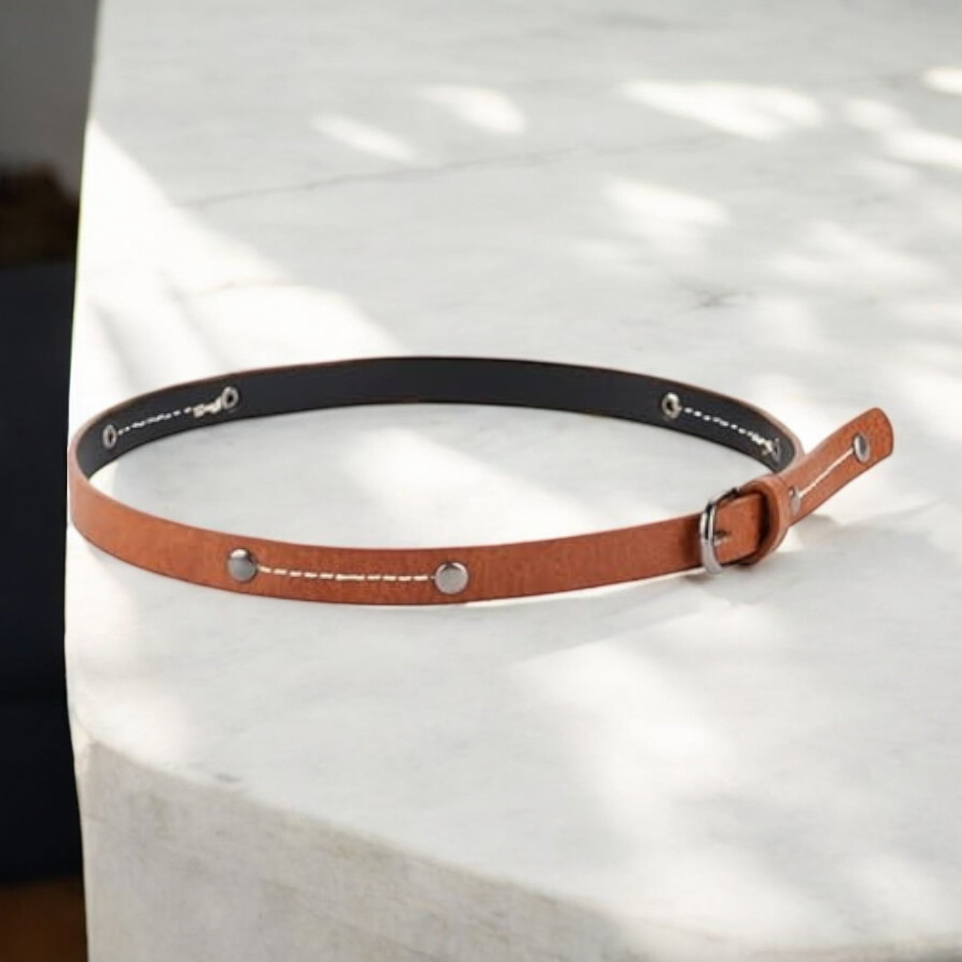 Elevate any plain hat with our textured faux leather hat band, designed with an antique silver buckle, studs, and detailed stitching for a refined finish.